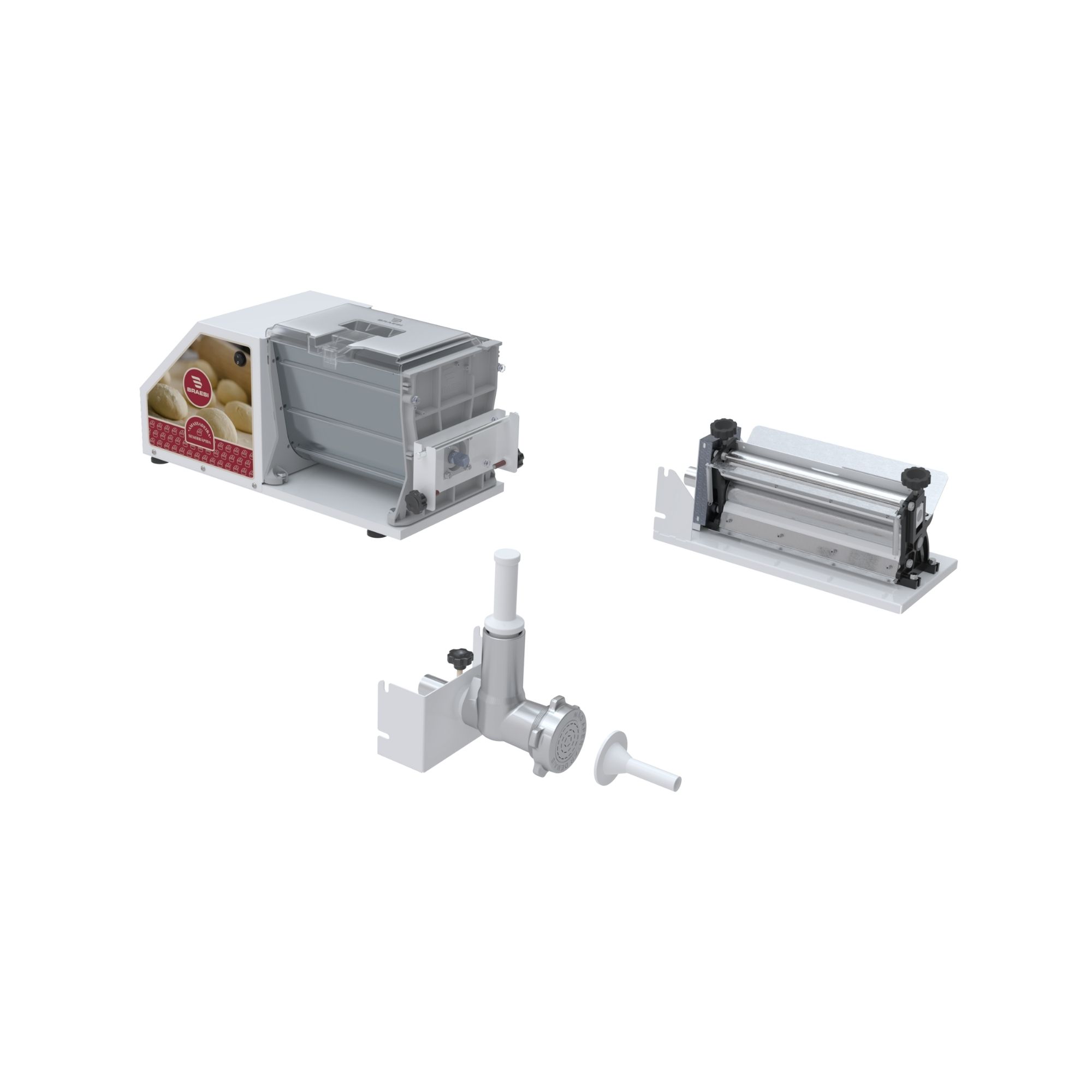 O modelo já acompanha kit laminador e kit extrusor, oferecendo múltiplas funções em um único equipamento — ideal para preparar e modelar massas, moldar biscoitos e até moer carnes. Além disso, inclui funil para ensacar linguiça e acessórios que ampliam as possibilidades de uso.
