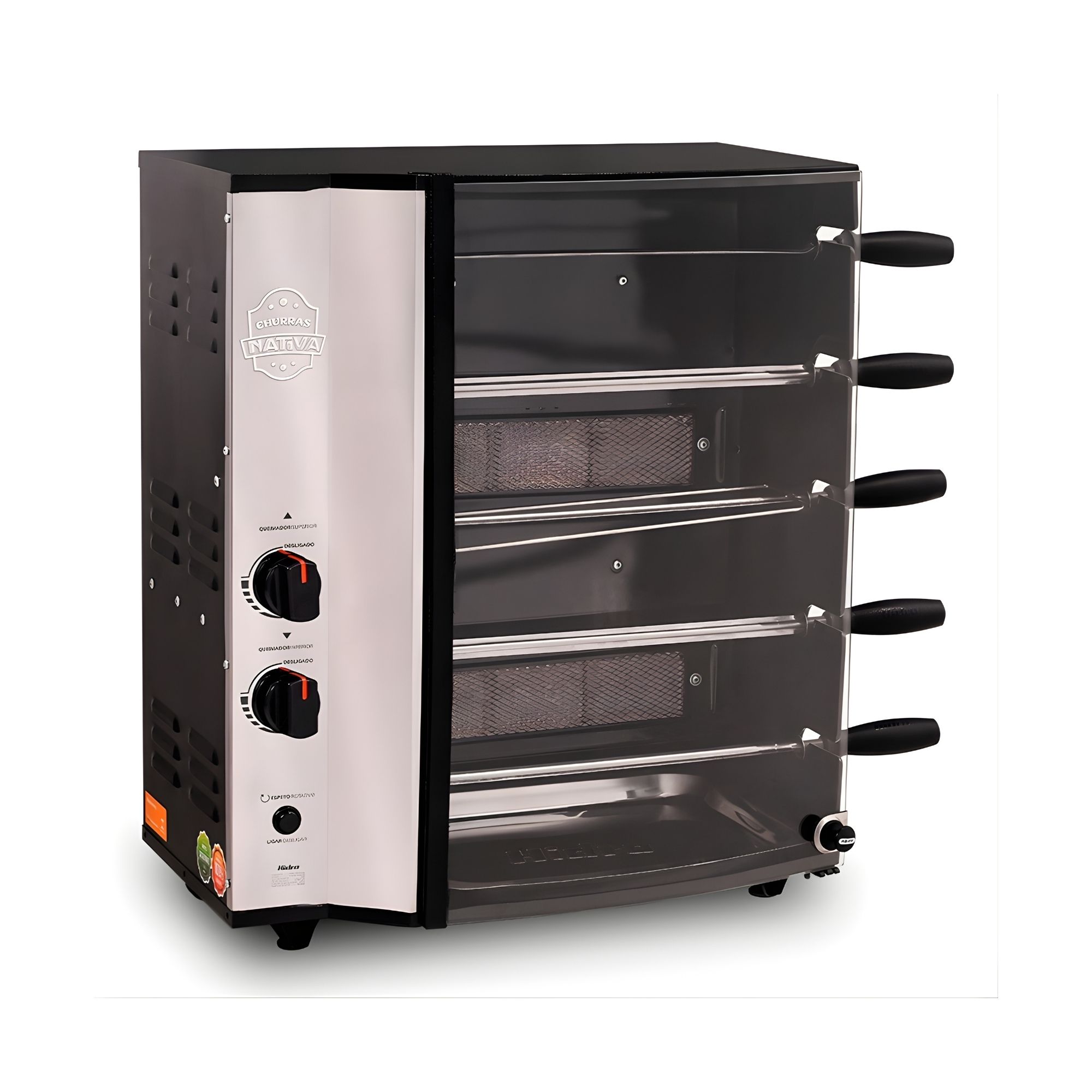 Equipada com queimadores a gás infravermelho, a churrasqueira garante uma distribuição de calor uniforme, reduzindo o tempo de preparo e elevando o padrão do churrasco. Com esse sistema, é possível preparar um churrasco completo em menos de 1 hora, mantendo o sabor, a textura e a suculência das carnes. Os espetos rotativos asseguram assamento homogêneo, eliminando a necessidade de manuseio constante.