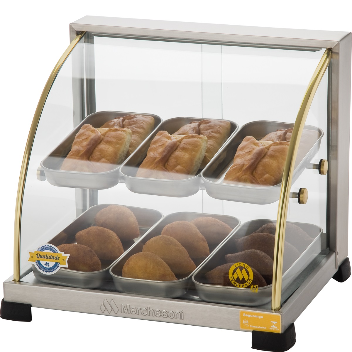 Produzida em aço inoxidável, a Estufa Ouro Curva é o produto ideal para seu negócio! Com frisos dourados e vidros temperados, ela garante elegância e qualidade enquanto mantém seus alimentos aquecidos!