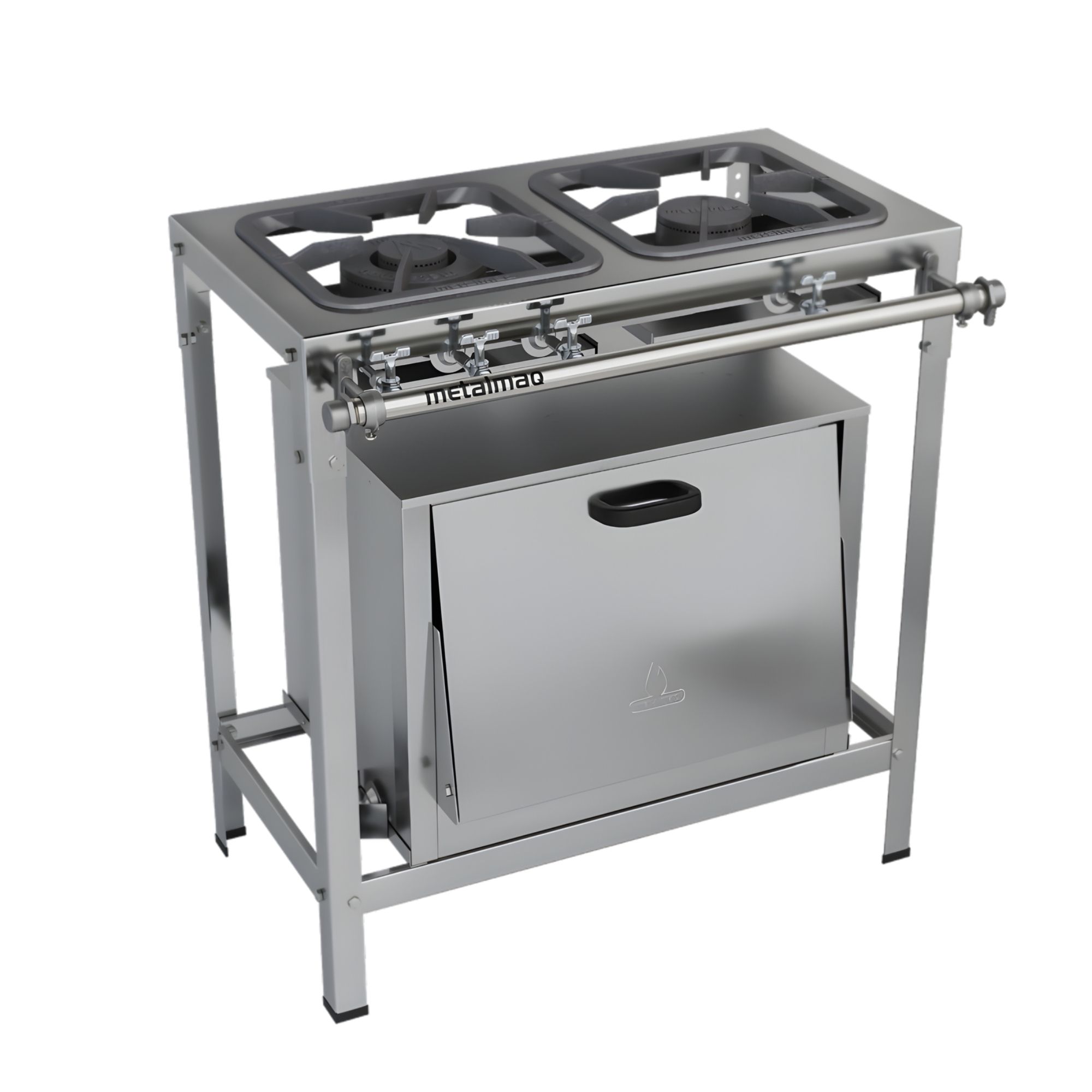 O equipamento também conta com forno com porta em aço inox e capacidade de 51 litros, ideal para assar diversos tipos de alimentos. Seu design modulável e desmontável facilita o transporte, limpeza e manutenção, tornando o fogão uma excelente escolha para cozinhas que exigem produtividade e robustez.