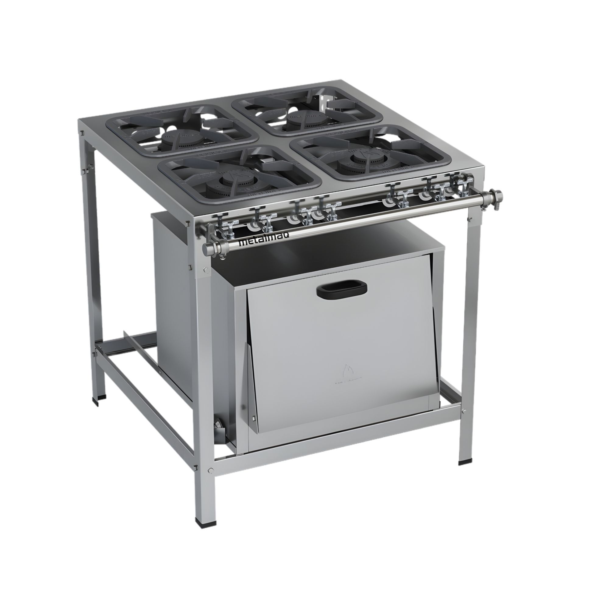 O equipamento também conta com forno com porta em aço inox e capacidade de 51 litros, ideal para assar diversos tipos de alimentos. Seu design modulável e desmontável facilita o transporte, limpeza e manutenção, tornando o fogão uma excelente escolha para cozinhas que exigem produtividade e robustez.